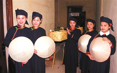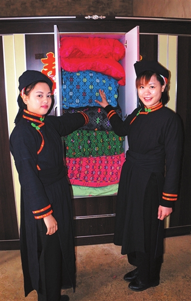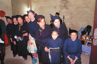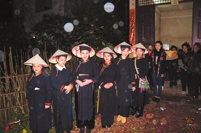 凌晨一点半,屋外仍细雨如丝,春寒料峭。梳妆打扮漂亮的新娘,在四个伴娘、两个官郎、一个官娘和一个挑担子的小姑娘陪同下,要出门去“美女村”的新郎家了。按传统习俗,新娘和伴娘出门每人都要戴一顶尖顶斗笠,官娘还要带一个壮锦编织的漂亮袋子,嫁妆除了家用电器,最少不了的是用自织的壮锦做面料的四张棉被和两个枕头。出门前,新娘的官郎照样以歌代言,嘱咐新娘到新家后如何做人持家,如何孝敬家父家母等等,殷殷教导,情真意切。新娘离开后,娘家的亲友们仍通宵达旦地唱歌。
