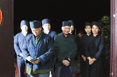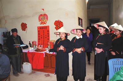 天亮了,新郎伴郎和新娘伴娘一起进行拜堂仪式,新娘的官郎在旁边唱山歌叮嘱新娘: