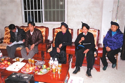 在新娘家旁边的亲戚家里,新娘的上百个亲朋好友早就坐满了屋子,也在开一场热闹非凡的“山歌演唱会”,引得附近的越南亲戚也来唱山歌凑热闹了。大家唱古歌今、谈苦说甜、对歌猜谜,这里有话筒、音箱等音响,所以歌声更嘹亮,气氛更热烈。动人的山歌一直唱到深更半夜,边陲小山村陶醉在幸福的歌声里。