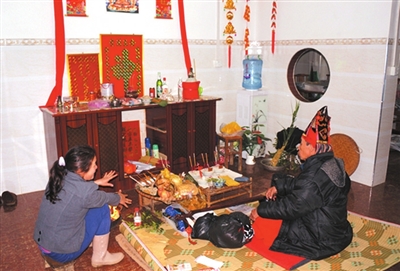 凌晨两点多,当新娘一行人驱车到达新郎家时,新郎家中正举行“补粮”仪式,天琴法师手持天琴,盘坐在屋子中堂边弹边唱,祈求新郎家中父老长命百岁、幸福安康。