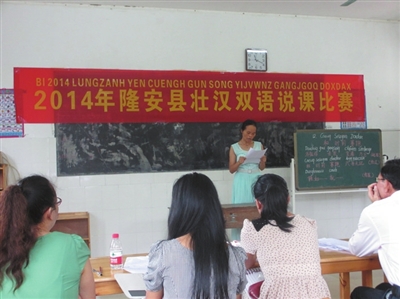 近年来,隆安县教育局对壮文教学工作也非常重视,每年都不定期地在县内几个壮文试点学校中开展壮汉双语教学的交流活动,其中有数次活动就是在荣和光彩学校举办的。2014年县教育局在校内举办了全县壮汉双语教研课和说课比赛,最近又成功主办了壮汉双语语文、数学课堂教学比赛,学校的双语老师踊跃参赛,并获得了第一、第二名的好成绩。