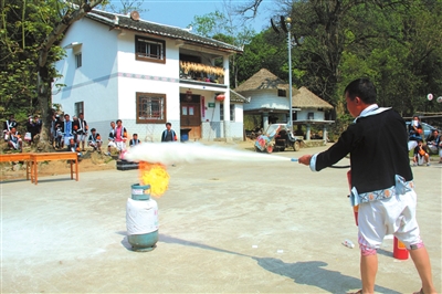 南丹县里湖瑶族乡王尚屯是一个集观光旅游、民俗风情表演、农家乐、休闲养生为一体的旅游景点,每年吸引着成千上万的游客前来观光游览。保障游客和当地白裤瑶胞生命财产的安全,做好消防工作显得特别重要。为此,清明节期间,该县应急办邀请武警南丹县消防支队官兵到王尚屯,对刚成立的18名党员应急服务队队员进行消防培训。图为灭火演练现场。
