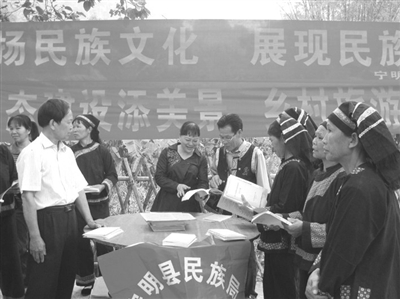 图为4月7日,民族局工作人员在濑江屯二月十九庙会歌坡节开展宣传活动。(宁明县民族局 熊宗平)
