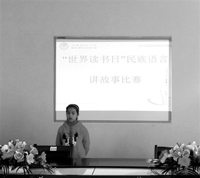 为了激发学生的读书热情,传承发展民族语言,提高学生的表达能力,近日,龙胜各族自治县马堤民族小学举行了民族语言讲故事比赛。图为该校的学生使用苗语讲故事的情景。(王永飞 涂 梅 摄)