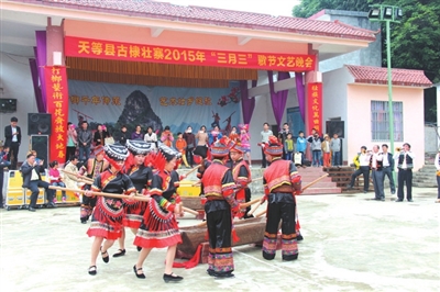 4月11日,天等县龙茗镇龙英居委会古棣壮寨民族工作示范点先后举办了第三辑民俗歌曲光碟首发式、“古棣壮寨南路山歌争霸赛”、特色美食一条街、文艺晚会、民族政法宣传、打榔艺术图片展、百家宴等一系列丰富多彩的民俗文化活动,喜迎2015年壮族“三月三”传统歌节的到来。