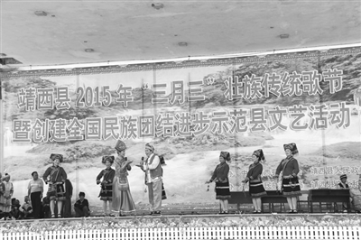 4月15日,靖西县委、县政府主办,靖西县民族局、县文化和体育广电局承办了2015年“壮族三月三”壮族传统歌节活动。活动内容有:抛绣球表演、民间民俗文艺展演、山歌汇演、开台山歌、猜歌、山歌比赛等。这次靖西县“三月三”壮族传统歌节活动,吸引来自县内外的近万名群众到场观看。图为靖西末伦表演。