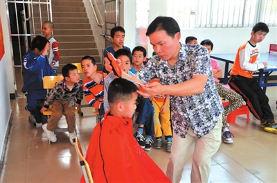 当天,覃启豪在爱人黄志娟的搀扶陪同下,带上理发工具,来到上林县特殊教育学校,为10多个头发长了的孩子理发。上林县特殊学校是一所集盲、聋、智障教育为一体的全日制寄宿制学校,现有学生66人,全部来自全县11个边远山村的贫困家庭。每个学期覃启豪都要来给这些孩子们免费理发两次,让家长减少了一定的经济负担,也和孩子们结下了多年的深厚友情。“每到新学期开学、每个学期期末,是我最惦记在特殊学校里读书的这群孩子的时候,因为我和他们一样都是身有残疾,我会尽我微薄之力去帮助他们,用我的实际行动去激励他们。”笔者问起覃启豪时,不太善于言谈的他还是说出了最质朴的话语。