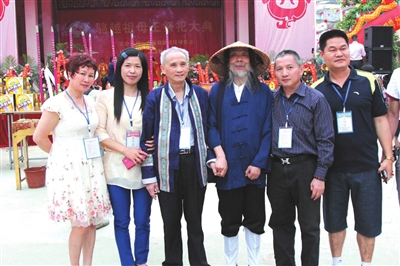 ▲4月20日,2015年中国壮乡·武鸣“壮族三月三”歌圩暨骆越祭祖大典在武鸣区罗波镇举行,民族风情浓郁的祭祀大典吸引了各地游客和民俗爱好者数万人。中央民族大学原副校长、博士生导师、国务院特殊津贴获得者梁庭望教授(左三)受邀参加骆越祭祖大典。(王杰清)