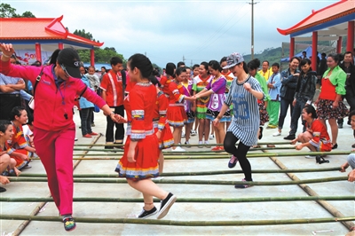 一对对碧绿色的“大翠鸟”伴着锣鼓节奏飞了出来,头转动、眼张合、嘴作响,转了几圈“觅食”,突然“看到”有鱼,“扑哧”一声“啄”去,把“鱼”叼住了!“边吃边喝水”,酒足饭饱后,双双飞去洗澡,洗完澡佯装小睡,一觉醒来开始嬉戏,追逐完后归巢……这是4月20日在东乡镇合群村北山庙戏台举行的“民族文艺表演”活动中上演的《翡翠鸟舞》的场景。翡翠鸟时而腾空,时而旋转,时而追逐,整个过程活灵活现、生动形象,看到精彩处,现场欢笑声响成一片。