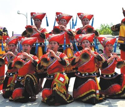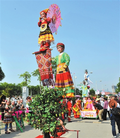 4月21日是农历三月三,来自广西各地的少数民族同胞在广西民族博物馆举办丰富多彩的传统民俗活动,共同欢庆民族佳节。在活动现场,侗族同胞吹响芦笙、邕宁壮族女子八音队员吹响唢呐欢迎八方游客的到来。平果县的壮族嘹歌对唱、大新县的“高腔诗雷”表演、宾阳县的民间“游彩架”巡游,还有来自靖西、南丹、环江、罗城、马山县(自治县)的民间女艺人展示本民族传统制作技艺,活动现场节目精彩纷呈,游人如织,气氛欢快热烈。(喻湘泉)