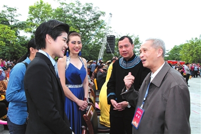 2004年以来,百色市依托壮民俗文化和壮民族风情,每年都在田阳县敢壮山布洛陀文化遗址景区举办布洛陀民俗文化旅游节,至今该节已发展成为百色一大特色品牌,并在东盟国家产生了深刻的影响。每年该节都有东盟国家的嘉宾前来参加,促进了广西甚至中国与东盟之间的交流。图为4月25日,中央民族大学原副校长、博士生导师梁庭望(右一),田阳县县委书记钟恒钦(右二)在今年布洛陀民俗文化旅游节举办的壮族始祖布洛陀祭祀大典现场与两位尊贵的泰国嘉宾交流。