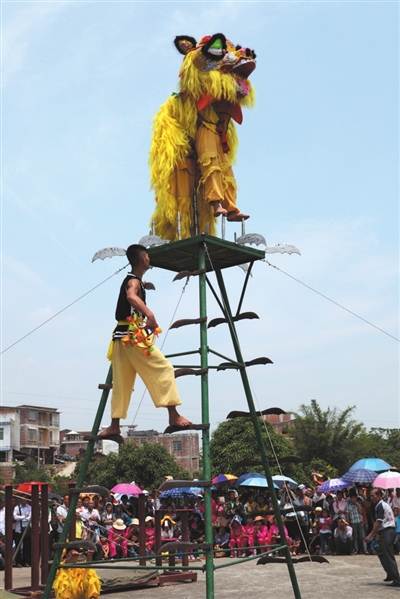 舞狮舞龙展演尽显非物质文化遗产魅力。田阳壮族舞狮技艺已列为国家级非物质文化遗产保护项目。为继承、保护、弘扬舞狮技艺,进一步打造田阳舞狮品牌,今年的布洛陀文化旅游节继续举行舞狮技艺展演活动。活动期间,田阳壮族舞狮艺术团将“双狮戏球”、“狮子上金山”、“刀尖狮技”、“狮游梅花桩”等各种“高、难、惊、险、奇、美”的绝技一一展示给观众,让游客们欣赏到了惊险和高超的舞狮技艺;同时,来自田阳民间的5支业余舞狮、舞龙队也为游客们献上了精彩的舞狮、舞龙表演,让游客大饱眼福。