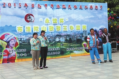 六县区歌手歌圩擂台上多调式赛山歌。今年的布洛陀民俗文化旅游节,来自百色市的田阳、右江、田东、德保县(区)以及河池市巴马、东兰县(自治县)的26支精英山歌队聚集在敢壮山歌圩,采用壮语的田州调、古美调、巴别调以及桂柳话汉语同台对歌,山歌内容包括强农惠农、改善民生以及美丽广西·生态乡村、平安广西、和谐家园等。歌词紧扣主题,内容健康,幽默风趣,积极向上,不仅全面展示了田阳县本土原生态的山歌品种,还充分展示了有关县区的优秀传统山歌,把山歌比赛和山歌展示相结合,让广大游客充分享受高水平的原生态山歌。此外,还有数百名群众自发分散在敢壮山各山坡上自由对歌,坡坡有山歌,日夜有歌声,让游客徜徉在歌海中。