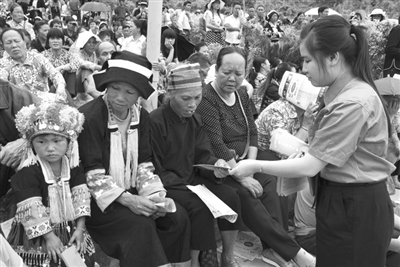 5月4日,是一年一度的朝里歌圩节,凌云县抓住这个契机,组织公安局、检察院、法院等单位工作人员到朝里瑶族乡那巴歌圩现场开展法律、法规宣传。挂标语、发放宣传资料、解答群众咨询等宣传方式收到了良好的效果,深受群众欢迎。图为工作人员在给少数民族群众发放宣传资料。