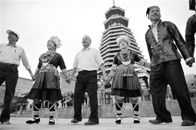近日,罗城仫佬族自治县老干部局组织离退休老干部代表送戏进侗寨。老干部们发挥文艺特长,通过乐器演奏、传唱山歌等形式,宣传民族团结,加强各民族交往交流,进一步促进各民族和睦相处、和谐发展。图为在该县龙岸镇大蒙村侗寨鼓楼前,老干部代表和侗族村民一起跳侗族多耶舞,共同唱响民族团结进步“和谐曲”。