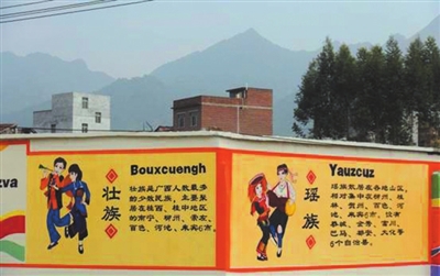该校在环形跑道一边制作了民族文化墙,绘制56个民族人物图,配有民族知识简介,内容丰富,图文并茂,通俗易懂,生动形象地展示了各民族的民风、民情和民俗,营造出一个良好的民族团结氛围。