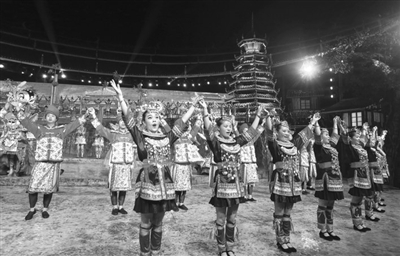 《坐妹》是中国首部侗族风情大型实景演出。该剧有机糅合侗族歌舞、服饰等文化元素,全景再现侗族传统婚恋、劳作习俗,自2011年9月底开演以来,坚持天天演,目前已演出超1000场次,成为侗乡文化旅游的“吸金”名片,深受中外游客追捧。图为侗族演员在三江鸟巢大剧场内表演侗族风情实景音画《坐妹》。(龚普康 摄)