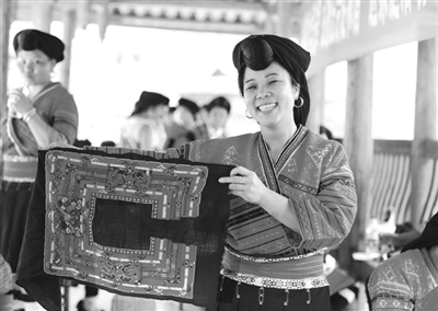 5月19日,龙胜各族自治县举办少数民族绣娘手工刺绣比赛,当地的50多名刺绣能手飞针走“绣”。通过比赛,让选手们交流刺绣技艺,并通过“传、帮、带”,帮助爱好刺绣的少数民族妇女转移就业,带动少数民族手工刺绣业繁荣发展。图为该县泗水乡白面瑶寨的红瑶妇女在展示刺绣作品。(韦吉阳 摄)