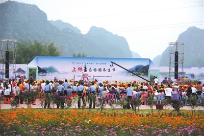 5月19日, 是中国旅游日。这一天,上林县在该县澄泰乡隆重举行“中国旅游日”南宁主会场暨上林生态旅游养生节开幕式,吸引众多中外游客到上林乐游壮族老家,分享中国长寿之乡的长寿奥秘。