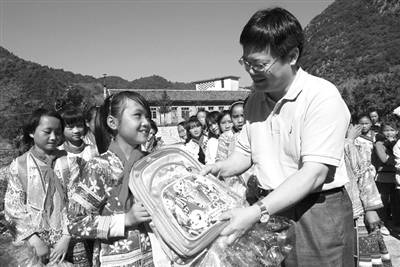 2013年6月,自治区新闻出版广电局帮扶田坝村建立自治区级示范性儿童家园,关注和关爱儿童家园的苗族留守儿童的健康成长。图为蔡健(右)给苗族留守儿童赠送礼物。(罗明考 摄)