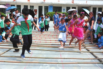 这是5月28日上午8时,环江毛南族自治县思恩镇人和小学全体学生在学校大门前用壮语演唱的迎客歌,欢迎广西民族教育发展中心领导和我区壮汉双语教育实验县(北片区)的壮汉双语教研员、壮汉双语小学壮语文骨干教师等来到学校参加“2015年壮汉双语教学研讨活动”。