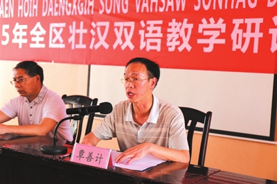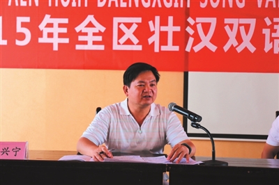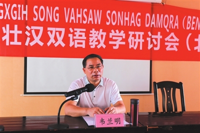 自治区教育厅民族教育处处长韦兰明在研讨活动总结会上,作了《做好壮汉双语教学工作》的讲话,充分肯定了举办本次壮汉双语教学研讨活动的意义,对活动给予高度评价。他说,这次壮汉双语教学研讨活动,是总结交流壮汉双语教育教学经验,提高壮汉双语教师的教学水平,促进壮汉双语教学实验工作稳步开展的重要活动之一,通过这次教研活动,对壮汉双语教学实验的目标、理念有了进一步的把握和认识,对进一步打开壮汉双语教学思路、增强二类模式实验的信心有了很大的帮助。韦兰明在讲话中对壮汉双语教学工作的实际情况做了具体分析。他指出,虽然近几年来自治区教育厅民教处多次举办壮汉双语教学培训班,使壮汉双语教师队伍建不断得到加强;进行课程改革提升了教学质量,特别是实施二类模式后,壮文教学工作开展得到了空前发展,但是,从目前情况看,培训方式、方法比较单一,双语教师短缺问题依然存在。针对教学工作存在的问题,韦兰明提出了以下要求:要进一步提高对双语教学法的认识;要充分认识开展壮汉双语教学的重要意义;要加强双语教学教研工作;要重视专业发展平台建设;农村学校信息比较闭塞,要创造性搭建学校教研平台。