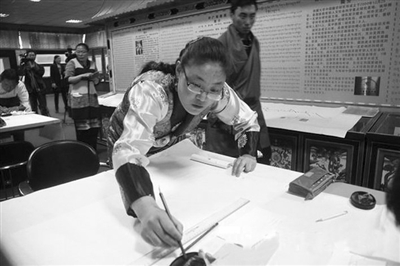 本次决赛分朱擦体、簇体、乌金体和丘伊体四种书法类型,最终在四种字体组分别角逐出4名一等奖选手。图为正在书写的女参赛选手 。
