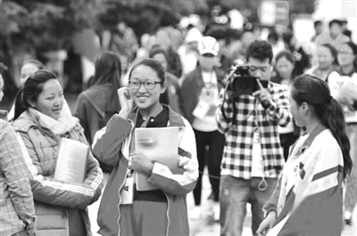 6月9日上午11点半铃声响起,2015年高考西藏地区考试全部结束。今年西藏共有21145名考生报名参加普通高考,其中农牧民子女考生占83%。除参加语文、数学、英语以及文、理综合四门考试以外,藏族考生还要参加本民族语言(藏语文)考试。藏语文是西藏高考自主命题科目。图为西藏学子走出考场,高兴地拿出手机向家长汇报各科考试情况。