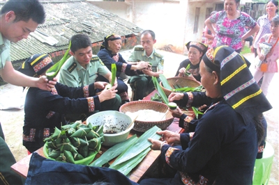 6月15日,宁明县峙浪边防派出所官兵与峙浪社区20多名壮族边民群众一起包粽子喜迎端午佳节。今年以来,峙浪边防派出所以深化爱民固边战略为契机,积极为辖区群众做好事、办实事、解难事,赢得了地方党委政府和边民群众的一致认可。1至5月,全所官兵共为辖区边民群众办好事25件,捐款捐物折合人民币1.2万多元。