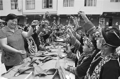 6月18日,在端午节即将到来之际,由巴马瑶族自治县文明办、巴马妇联联合主办,东山乡党委、政府承办的2015年“庆端午 忆屈原 话爱国”主题文化活动在东山乡卡桥村举办。该乡道德模范人物给东山乡中心小学的40多名困难留守儿童讲故事、讲德育,青年志愿者手把手教孩子们包粽子、煮粽子。图为志愿者在教瑶族孩子包粽子。