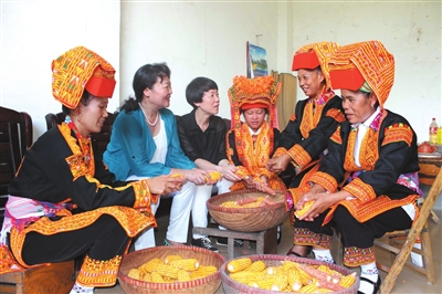 图为各级妇联党员干部与宁明边境瑶族妇女边剥玉米边谈心。
