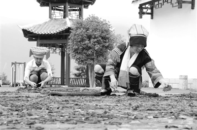 地处广西大瑶山的金秀瑶族自治县有着良好的生态环境,辖区内植物品种十分丰富。时下正值野生红天葵采摘时节,村民将其采摘回来,用传统的柴火蒸、太阳晒方式加工。红天葵既可作纯天然药材,又可作消暑饮品。目前,干葵市场价格为每公斤200多元,供销旺盛,可为当地群众带来一笔可观的经济收入。图为6月28日,六巷乡六巷村的村民正在晾晒红天葵。(高如金 摄)