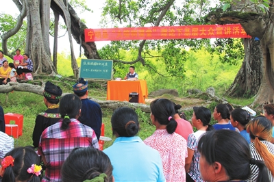 图为7月2日,宁明县法制办主任刘军在该县明江镇“大榕树课堂”向群众讲授依法治国知识讲座。