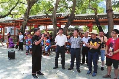 坛板坡的大榕树下,少数民族群众身穿盛装吹响八音,打起腰鼓,一片喜气洋洋;古寨瑶族乡的广场上正举行民族文艺展演,壮族会鼓、打榔、打扁担……丰富多彩的表演让记者团大饱眼福。在南宁市江南水街,弹奏天琴的姑娘用轻柔动听的歌声给酷热的天气带来一丝清凉。记者团一路融入少数民族群众的文化生活,学习打糍粑,品尝自酿土酒,亲身感受民族文化魅力。
