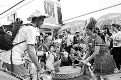 去年以来,都安瑶族自治县在头亮屯实施少数民族特色村寨保护与发展建设,把该屯建设成建筑风格突出、文化风韵浓郁、民族旅游兴旺的特色村寨,吸引不少中外游客慕名前来旅游观光。图为7月10日,在头亮屯,一位外国游客与当地村民一起体验《民族会鼓》的民族文艺乐趣。(韩金秦 摄)