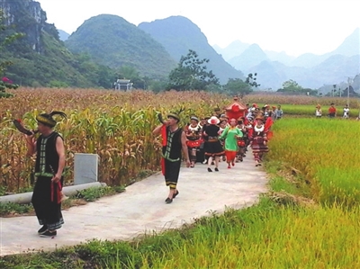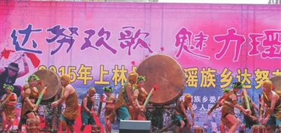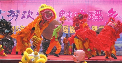 上午9点,设在该镇镇马街上的主会场锣鼓喧天,醒狮起舞,充满浓郁民族特色的瑶族风情原生态文艺表演徐徐拉开帷幕。由镇圩瑶族乡镇马剧团自编自演的节目《千猴戏鼓》让人大饱眼福,再现了瑶族先民狩猎、农耕和与大自然斗争的情景,展示了瑶族人民不屈不挠、勇于攀登、追求卓越的精神风貌,表现出瑶族人民对幸福生活的憧憬、对美好生活的向往和追求。“打灯过吉列,列灯过吉伦,壮利比勒道,卡搞重龙表,依啊耶……”一身瑶族服饰打扮的镇圩瑶族乡瑶山歌艺术团的演员们悦耳动听的瑶山歌同样获得阵阵欢呼声。