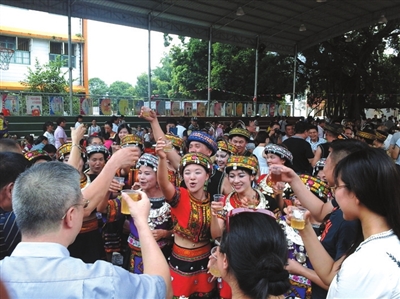 节日当天,镇圩瑶族乡的大街上还展出各种特产、民族工艺品和美食。其中,金银花最受大家的青睐。以歌迎客、以酒敬客,大碗喝酒、大块吃肉,是瑶族的传统习俗。设在排岜庄的“百家宴”,体现了瑶家的热情好客,宴席上各种瑶族美食让人看着就垂涎三尺。