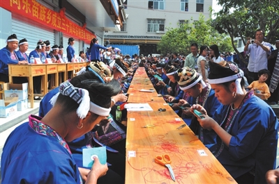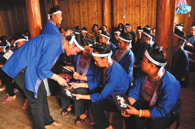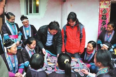 同时,同乐乡整合多方资金,依靠项目扶持,投资40万元,建成建筑面积450平方米的侗族刺绣技艺传承培训基地,投入28万元兴建同乐村刺绣楼。抓紧和扩大侗族刺绣民族文化进校园活动范围,从小强化技术培训,在全乡中小学校全面铺开民族文化进校园活动,壮大刺绣队伍,改变传统观念,树立创新意识。加大侗族刺绣的宣传力度,利用坡会节、“三·八”妇女节举行刺绣比赛和展示活动,为侗族刺绣提供技艺交流和学习的平台。