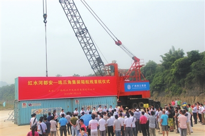 昔日红水河畔无人问津,今朝黄金水道淌金流银。红水河都安至珠三角集装箱航线是河池市开通的第一条通往珠三角地区的水运集装箱航线,航线从都安红渡作业区起航,途经来宾-梧州-肇庆,最后抵达广州港,全程约970公里,航程约7天。该航线的开通,结束了河池水运没有集装箱运输的历史,对于拉近河池(都安)与珠三角地区的距离,促进河池(都安)与珠三角地区的产业融合,带动沿江产业升级发展具有重要意义。