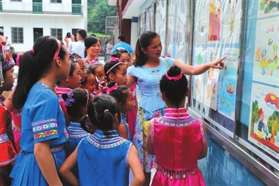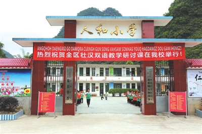走进人和小学校园,教学楼上,鲜红的“以壮为主,壮汉结合,以壮促汉,壮汉兼通”的壮汉双语教学工作“十六”字方针特别醒目。学校在环境布置中,处处体现出浓浓的壮汉双语教学氛围。在学校的板报、文化长廊 、学习园地、固定标语上面,都使用壮汉两种文字及具有壮民族特色的图案。陆银核校长告诉记者,为了营造壮汉双语教学氛围,学校还经常性举办壮文才艺展示活动,如学校每年都举行讲壮语故事、壮文作文以及壮文书写比赛等活动,激发了学生学壮文爱壮文的兴趣。