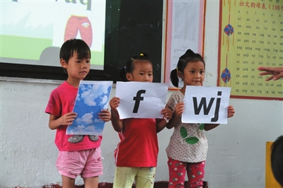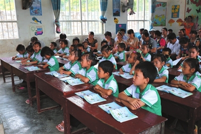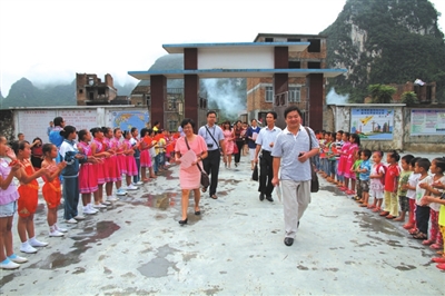 这是5月28日上午8时,环江毛南族自治县思恩镇人和小学全体学生用壮语演唱的迎客歌,欢迎参加全区“2015年壮汉双语教学研讨活动”的壮汉双语教研员、壮语文骨干教师等到学校观摩壮汉双语教学示范课。这种欢乐、体现壮民族文化的场面,也让去年10月参加全区壮汉双语学前教师“快乐壮文”培训班的教师们感受到人和小学浓厚的双语教学的氛围。一位壮文骨干老师听了人和小学老师的壮汉双语教学示范课后,感动地说:“人和小学的壮汉双语教学示范课堪称我区壮汉双语教学的典范。”人和小学在壮汉双语教学工作中因成绩突出,被自治区教育厅列为自治区壮汉双语教学示范基地。