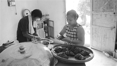包粽子是壮族传统习俗,逢年过节家家户户都包粽子。如今,壮族农村老百姓的生活越来越富裕,想吃粽子已不用等过年过节了,只要想吃就动手包。图为8月2日,上林县巷贤镇板石村村民石利峰与婆婆一起包粽子。(本报记者 覃 永 摄)