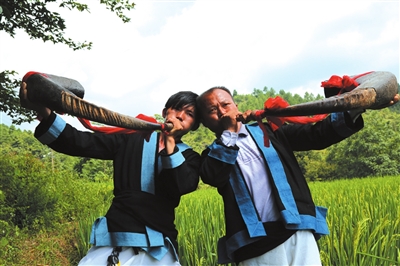 图为王尚屯白裤瑶胞在小年节上吹起了牛角。(符龙强 摄)