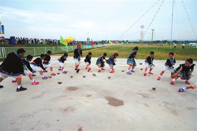 参加表演项目《玩转陀螺》比赛的是南丹县里湖瑶族乡的白裤瑶小学生们,当他们身着本民族服装出现在鄂尔多斯的表演场地时,立即吸引了观众及摄影记者的目光,人们纷纷走上前来与他们合影留念。这12名学生最大的12岁,最小的10岁。他们仅仅经过一个学期的训练,小小的陀螺无论在地上还是在手里都能玩耍自如,赢得现场观众阵阵的叫好声,也得到了评委的肯定,被评为表演项目的二等奖。