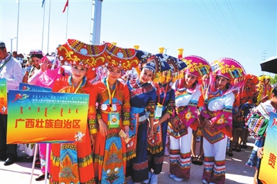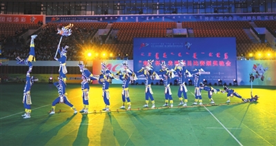 8月16日晚,第十届全国民运会在鄂尓多斯市体育中心体育馆举行表演项目的颁奖晚会,广西代表团的《板鞋龙》喜获一等奖。