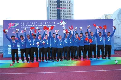 8月15日上午,参加第十届全国民族运动会的广西花炮队在鄂尔多斯市东胜区全民健身活动中心田径场与上届冠军北京队进行了激烈的拼杀,最终以14比10拿下这场比赛并取得这个项目的冠军。