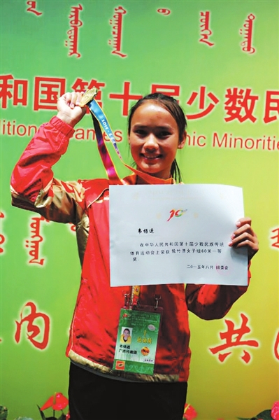 8月14日晚,第十届全国民族运会组委会工作人员把韦杨遮在独竹漂女子60米直道竞速获得的一等奖奖牌和证书送达运动员村交给其本人,并向她表示祝贺。