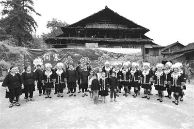 近年来,该县通过举办各种民族传统节庆活动,大力传承和保护侗族大歌、芦笙踩堂、风雨桥、鼓楼等侗族民俗文化及侗族特色建筑,吸引众多游客前来旅游观光。图为老、中、少三代侗族歌手同唱侗族大歌。