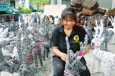 “这些打包装车的村民都来自附近村屯,农闲时他们就来这里做零工,每人每天40元,他们装的这批货正准备发往欧洲。”公司总经理韦昌英指着厂房里聚积如山等待装运的藤编说,“目前公司年出口额达300多万美元,在整个都安来说,我们是规模最大的。”
