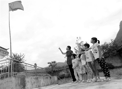 8月31日,融安县东起乡安太村安太小学迎来秋季开学的第一天,学校唯一的老师谢秀清带领新入学的一年级女学生上了开学第一课。安太小学地处偏远山区,目前只有5名学生和1名老师。图为当日,谢秀清老师带领一年级新生认识五星红旗。
